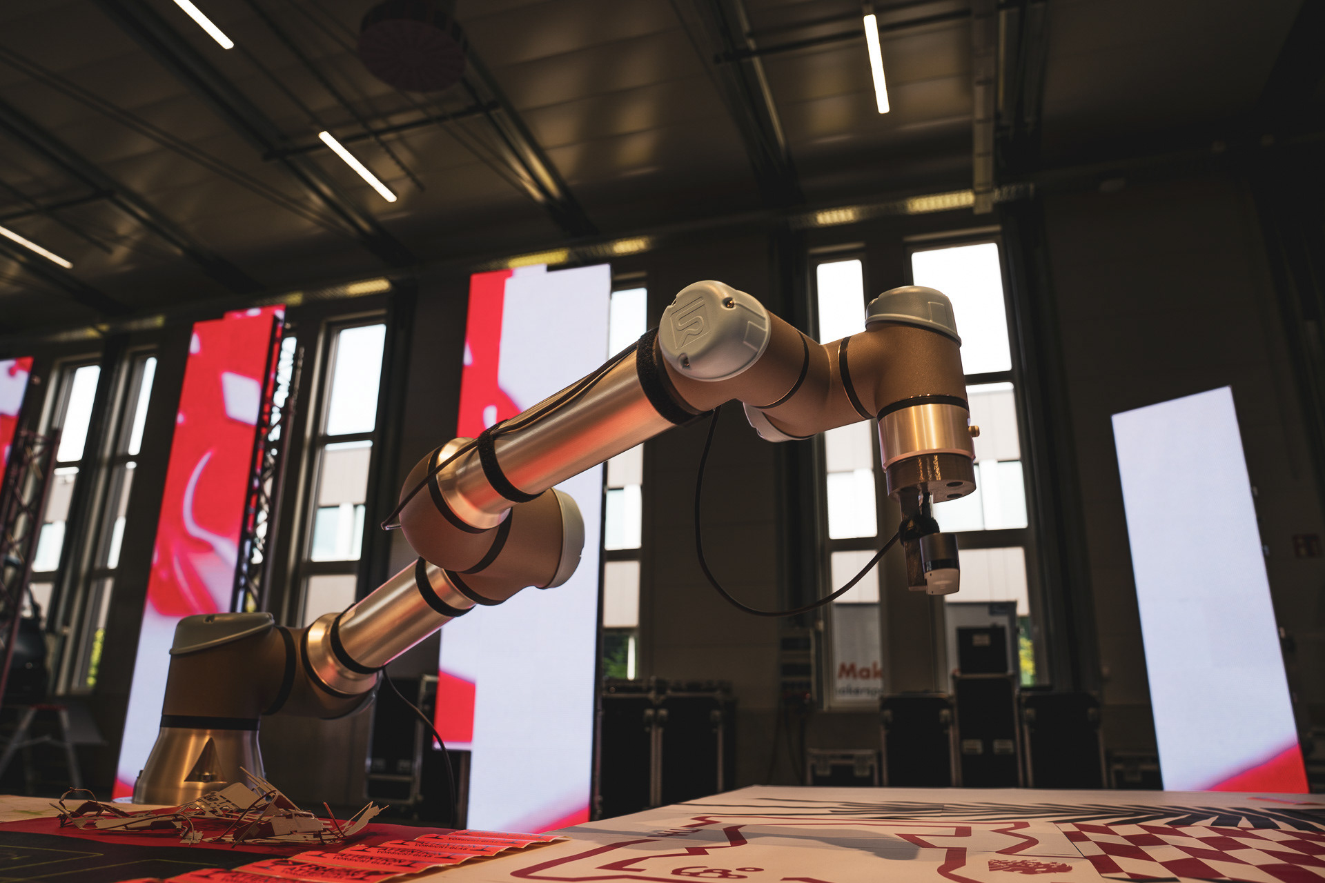 The team developed a custom connection protocol to enable seamless robot control, allowing for the rapid design of B-Bot’s performance. After a series of workshops and prototyping sessions together, Labbinaer transformed an industrial robot into a lively performer inspired by breakdance culture.